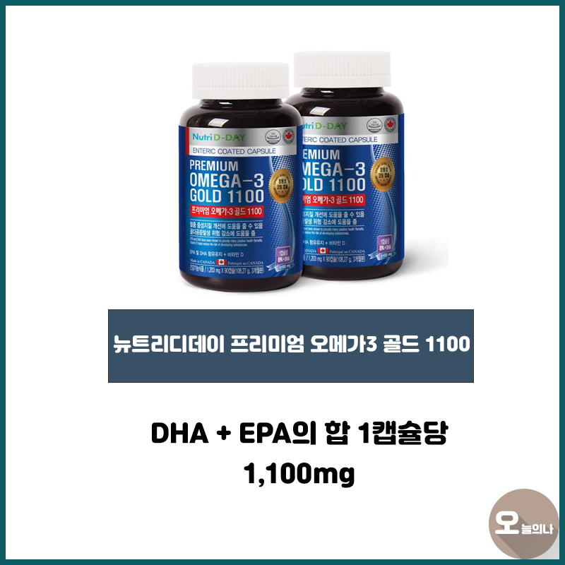 DHA + EPA 합이 1,100mg인 이 제품은 뉴트리디데이 프리미엄 오메가3 골드 1100과 함량은 같으나