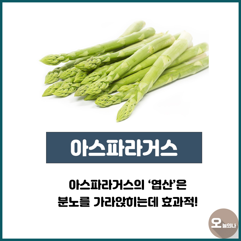 보통 찌거나 구워 먹고 스프에 넣어 먹기도 하는 아스파라거스는 분노를 가라앉히는데 아주 효과적 입니다! 아스파라거스는 '엽산'이 풍부한데 이 엽산이라는것은 기분을 상쾌하게 하고 긴장된 상황에서 긴장을 어느정도 풀어주는 효능을 가지고 있지요.